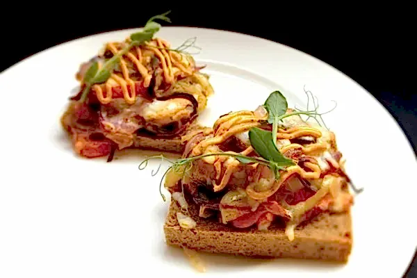 Состав:Ржаной тост, сливочно-томатный Pin-Up черри, болгарский перец, мидии киви, лук красный, моцарелла, зеленый лук, соус спайси.
