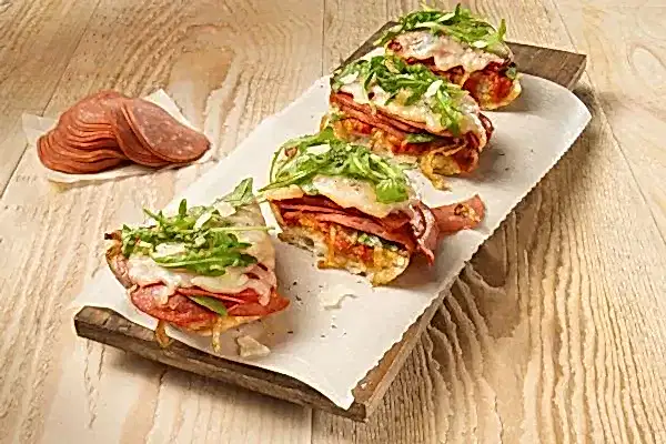 Состав:Чиабатта, сливочно-томатный соус, пеперони, Pin-Up стручковая фасоль, зелень, соус спайси.