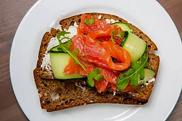 Состав:Ржаной тост, сыр, майонез, Pin-Up холодного копчения, свежий огурец, зелень.
