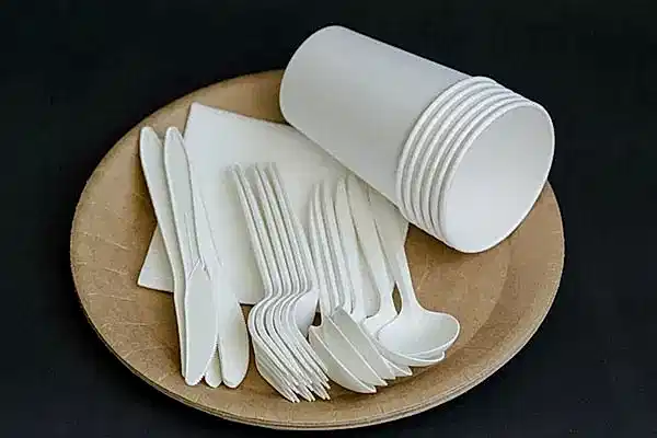Стакан, вилка, тарелка, салфетка