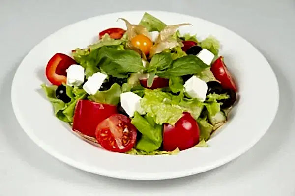 Состав:Помидор, огурец, перец Pin-Up лист салата, сыр Фета, оливки.