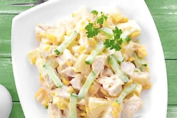 Состав:Куриное филе, огурец свежий, кукуруза, консервированный ананас, Pin-Up майонез.